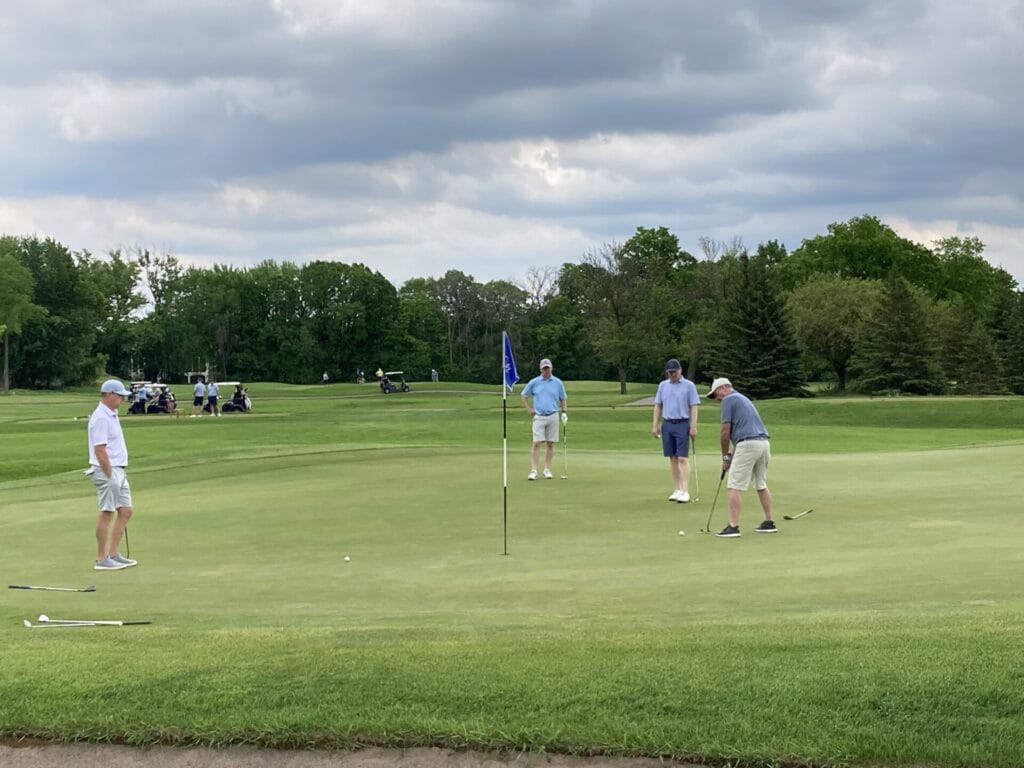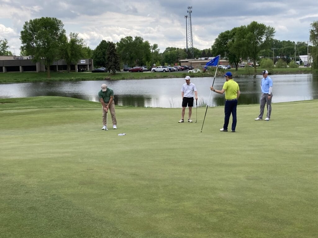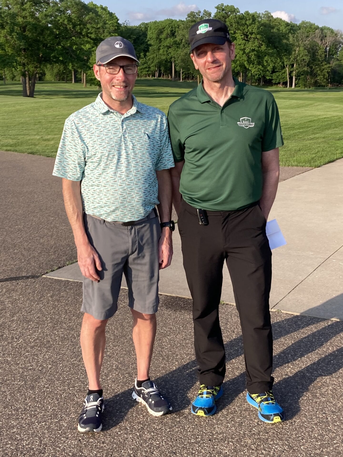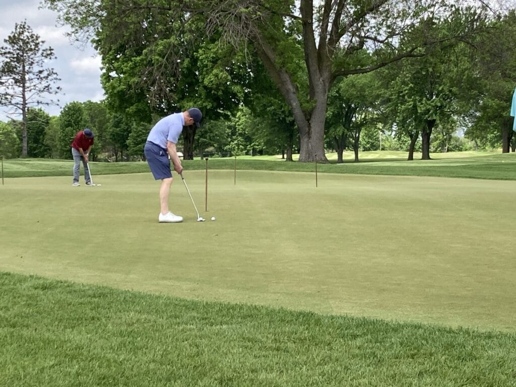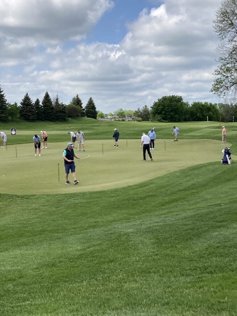 Tournament Coordinators Phil Jirsa and Mark Schmidt. Thank them when you see them.The check in boys. Phil Jirsa, Tom Schaurerman and Pat Logan. Thank them as well.Pre Tourney warm ups.Just a bit outside.Pre tourney putting.Phil Jirsa, Gary Mullen-Schultz, James Hove and Eric PetersenA typical uphill, downhill 10 foot bender.One of these guys made a 30 footer on 18.Jamie Kingston and Brian Kaul.Look at those skies!Jamie Kingston tees off on 14. BK analyzes the technique.The bird sings on #6.Low Gross winners putting on #1.