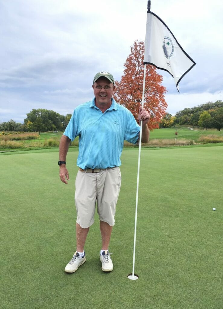 Drew had qualified for the EW Shoot-out by participating in both of our major events this year, the Spring Stag and the Club Championship, as well as in Tuesday League, Thursday League and Best Weekly. But, as he headed to the first tee, Drew was, in his own telling, feeling a bit nervous. And perhaps it was his case of the jitters that led him to struggle through his first three holes, carding a triple bogey on number 2 and a double bogey on number 3. Nevertheless, the great game of golf had some excitement in store for Drew that was going to more than make up for those earlier travails. So, as he stood on the 4th tee, Drew’s anger at the prior two holes motivated him. He took his time standing over the ball (no surprise for those of us who have played with the Drew Man). And, sure enough, his drive sailed long and straight down the middle of the fairway. But even so, with a steady headwind, he still faced 225 yards to the hole for his second shot. Crediting Thursday teammate Rick Danmeier for his oft-repeated advice to slow down his swing, Drew took a deep breath and made a smooth pass at the ball with his 2-hybrid. His shot cut through the wind nicely and headed just right of the middle-left pin position, bounced left, rolled towards the hole—and in it went. High fives and a photo shoot followed and, needless to say, the albatross contributed to this being one of our more memorable EW Shoot-Outs ever. Not to mention a memory that Drew won’t ever forget.